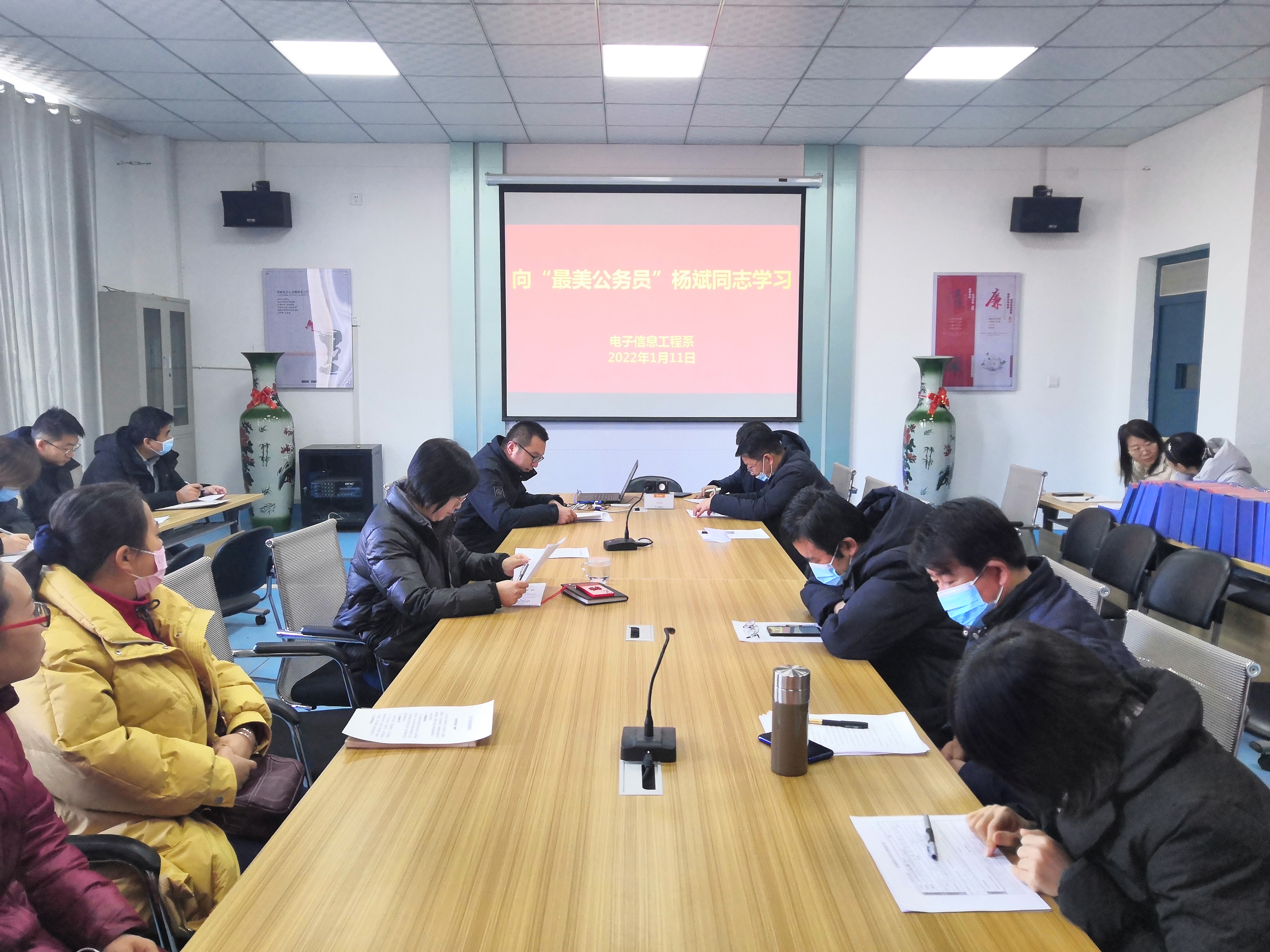為深入學習貫徹習近平總書記重要指示精神,表彰先進、弘揚正氣,引導廣大黨員、教師胸懷理想、堅定信念,開拓進取、敬業奉獻,在社會主義現代化建設各項事業中發揮先鋒模范作用。1月11日,電子信息工程系組織全體教師學習“最美公務員”楊斌同志先進事跡。