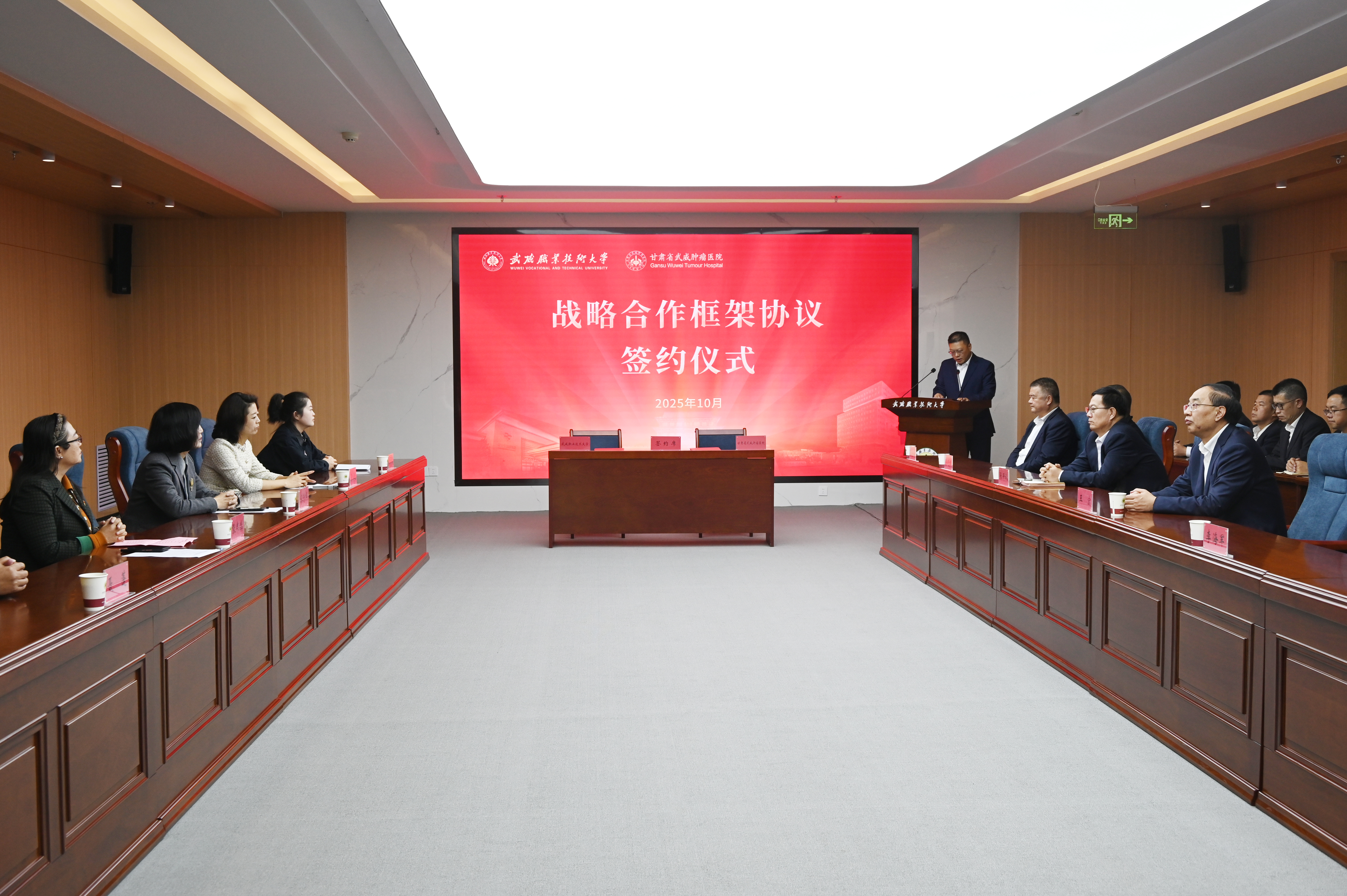 10月12日下午,武威職業技術大學與甘肅省武威腫瘤醫院舉行戰略合作框架協議簽約儀式,標志著雙方合作進入新階段。這是落實“健康中國”戰略、推動醫療與教育深度融合的重要舉措,將助力“健康甘肅”建設和武威市“兩擎牽引、五極迸發”發展格局。