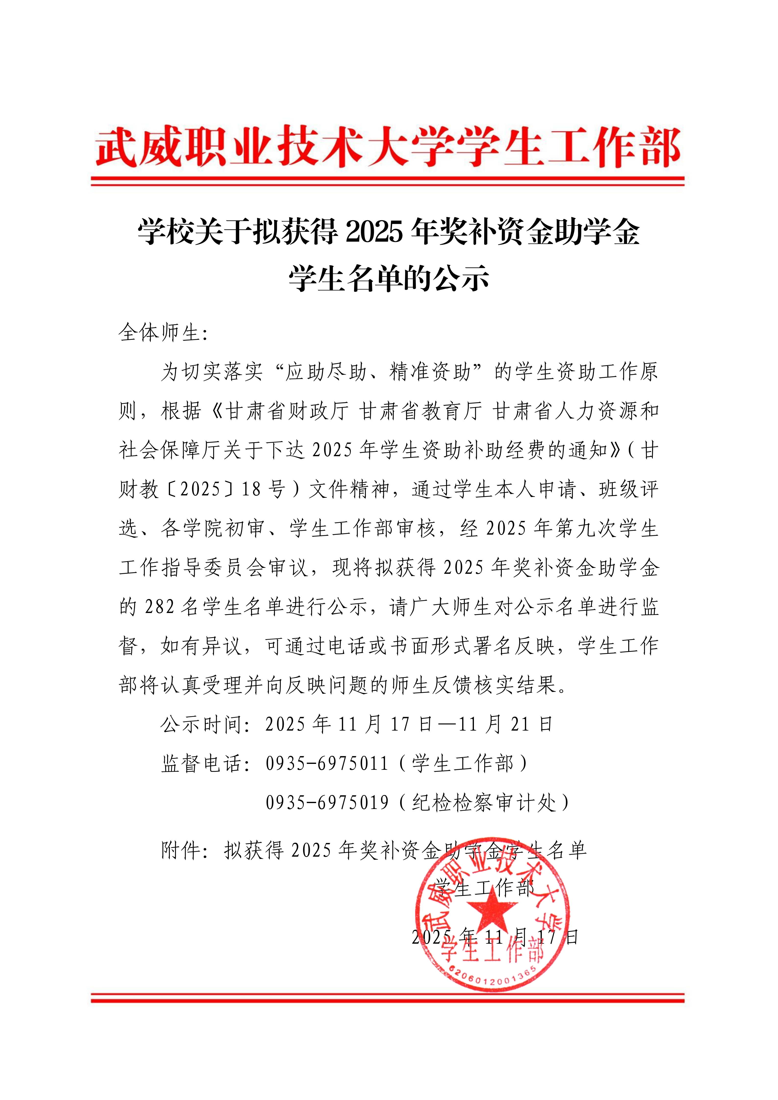 學校關于擬獲得2025年獎補資金助學金學生名單的公示