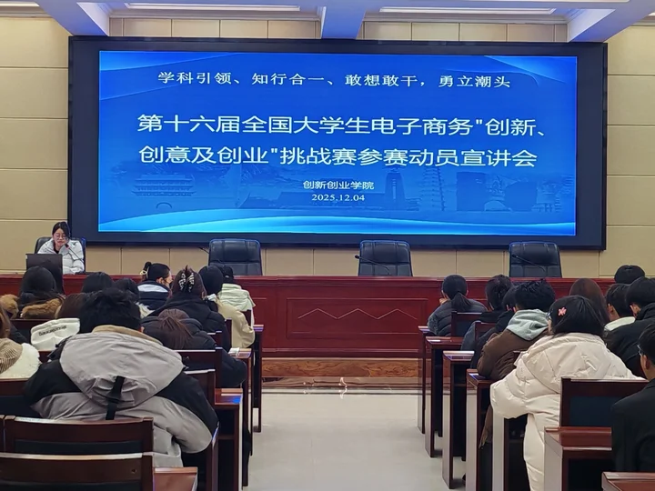 為積極備戰第十六屆全國大學生電子商務“創新、創意及創業”挑戰賽,激發學生參賽熱情,提升項目質量,創新創業學院于12月4日在行樹樓北側報告廳舉行大賽動員宣講會。來自全校9個學院的師生代表共計120人參加了本次動員會。