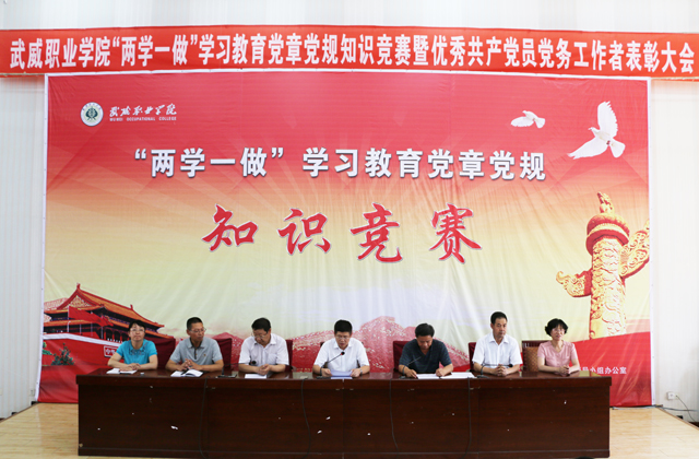 7月6日下午,武威職業學院“兩學一做”學習教育黨章黨規知識競賽暨優秀共產黨員、優秀黨務工作者表彰大會在尚德樓正德廳召開。黨委書記張國民,黨委副書記趙明,紀委書記張富國,副院長翟存祥、王永緒、潘玉華、田迎春出席會議。直屬附屬醫院黨委主要負責同志、各黨總支(直屬黨支部)書記,各部門負責人,受表彰的優秀共產黨員、優秀黨務工作者以及參加競賽的代表隊成員共270人參加了知識競賽活動和表彰大會。表彰大會由黨委副書記趙明主持。